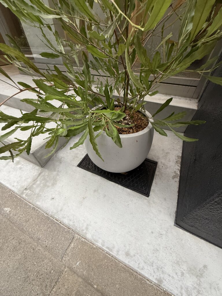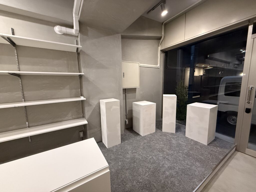 前面道路に面する大開口を全面ガラスのフロントとし、路面から奥まで視線が抜ける明快な構成とした。セレクトされたプロダクトが並ぶ際には、その密度や多様性自体が通りに向けたファサードの表情となる。このガラス面はショーウィンドウも兼ねており、ウィンドウ際に配置した什器に“推し” のプロダクトをピックアップ展示することで外部からも視認できるよう計画しており、PR の一端を担わせるものである。