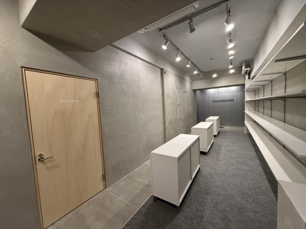 この可搬性は、施工過程の中で自然に導かれたものだが、ショウルームの外への展開を意識した結果でもある。「 monotomoi」は、合同展示会やポップアップなど外部での発信も積極的に行なっている。そのため什器やサイン類は可動性・再利用性を備えているべきと考えた。