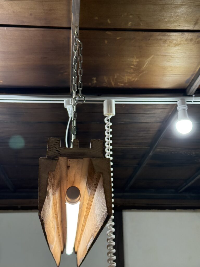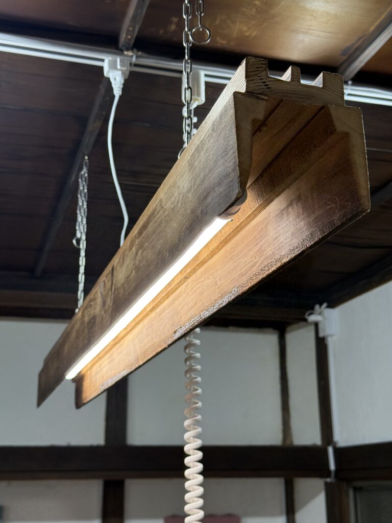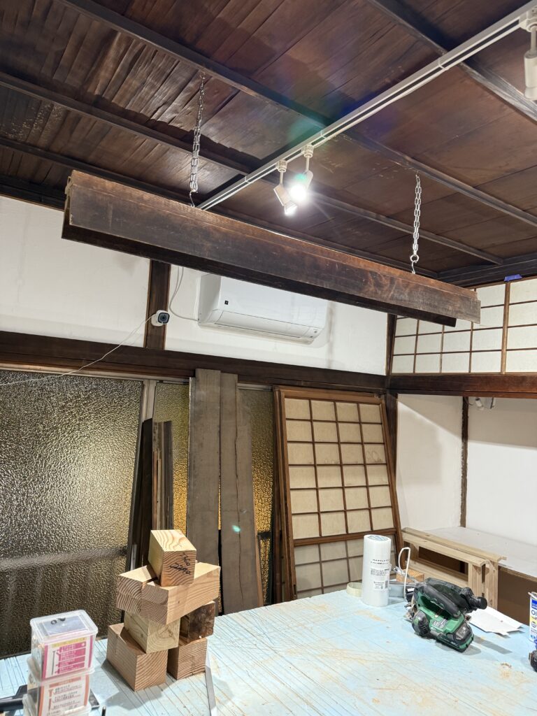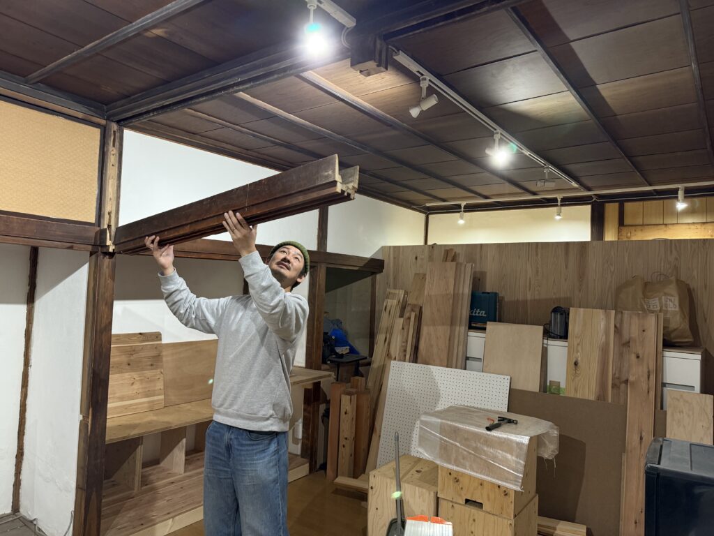 費用を抑えるために、移転予定だったmagnecto.事務所から大量の資材を運び込んで、壁面の漆喰塗りなど施主参加型の工事を行なった。いろいろな材料が使われているのはそのためだが、結果としていい雰囲気でまとまったように思う。現場で出た廃材を照明に転用したり、変なことを色々試したりしている。天板の仕上げには養生板を敷き、汚れればページを捲るように板を張り替えるというつもり。