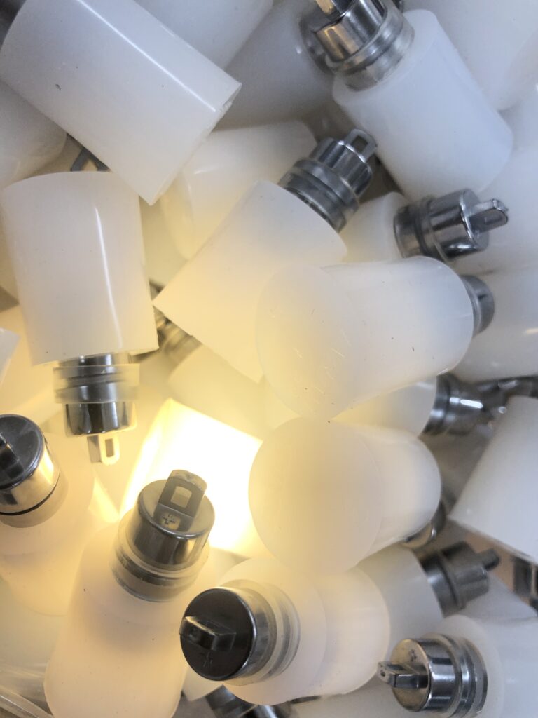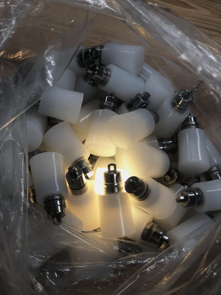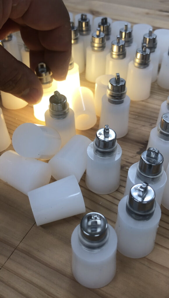 イベントは夕方まで行われるため暗くなってからも目立たせたい、ガジェット感を作りたいと考え、電飾を仕込もうとしたが、裏面も見えている場所なので配線がぶらぶらと見えてくるのはNGとし、乳半のシリコン栓に電池式の光源を埋めるというプロダクトを開発(と云うほどのもんでもないが、まあ他所では見たことないしオリジナルだと云うことで)。シリコン栓が光り、どことなくマーキーライトのような雰囲気を作り出すことに成功。
