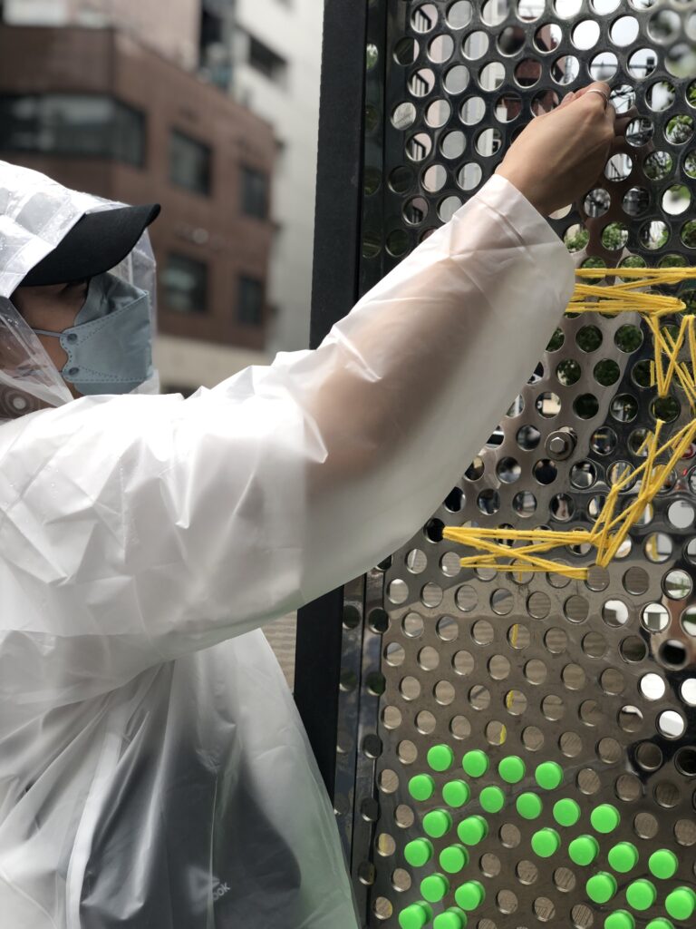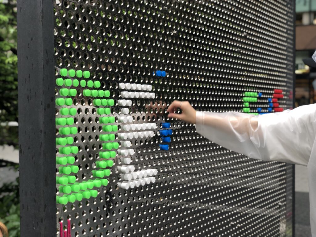 穴から押し込んだ際に押し込みすぎたり、向こう側に落ちたり、通行人や来場者が触れてすぐ落ちてしまう、などの懸念点を十分に検討した結果、テーパーがかかっている形状且つ弾性のあるこの実験用シリコン栓にたどり着いた。意外にもパキッとしたいろいろなカラーバリエーションが存在することがわかり、今回のカラートーンに若干ネオンぽさを加えることにした。