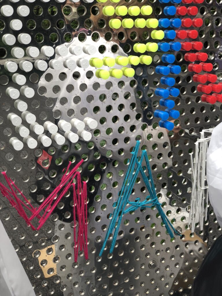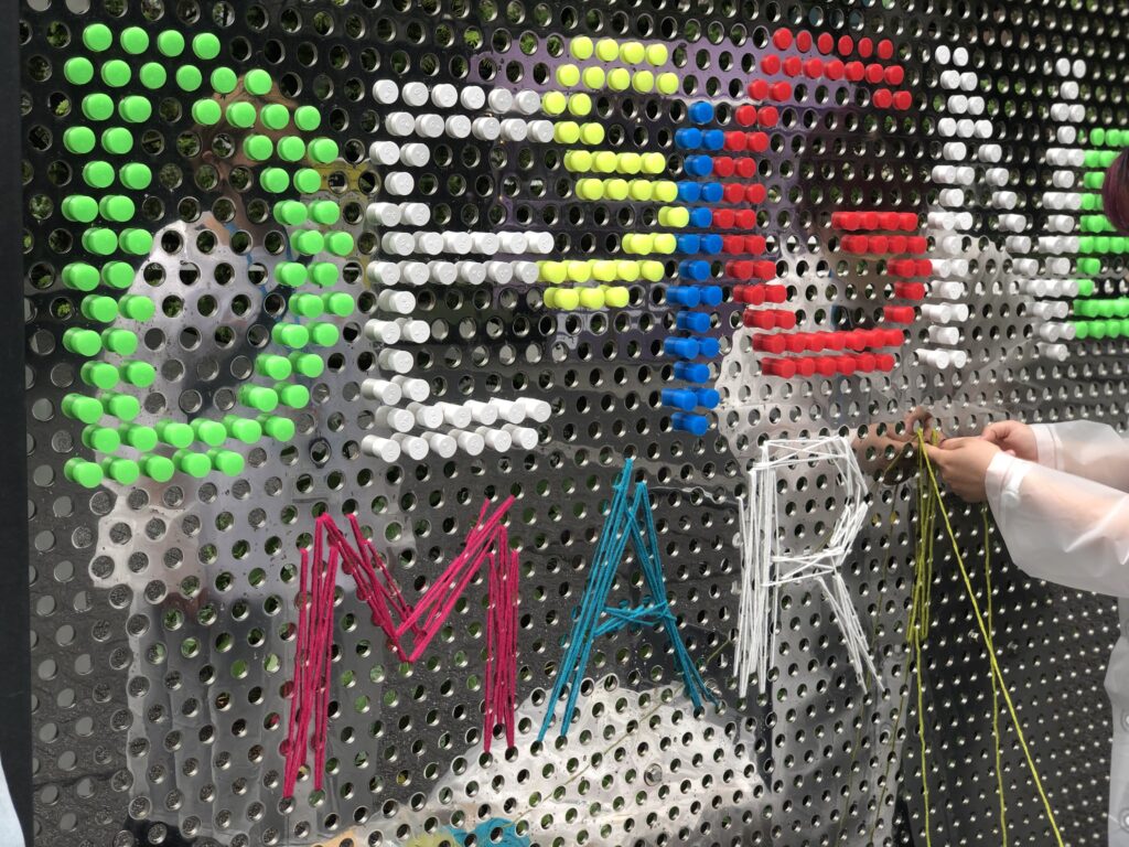 他の素材としては蛍光色の毛糸だったり、手芸用の所謂ポンポンを取り入れているが、ポンポンが色の粒として成立していてサイズも可変であることから、かなり思惑と合致した素材であった。
